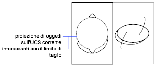 Specifica la proiezione sul piano XY del sistema UCS corrente. Il comando taglia solo gli oggetti che non intersecano il limite di taglio nello spazio 3D.