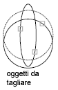 Modalità Standard. Per tagliare gli oggetti, prima selezionare i contorni e premere INVIO. Quindi selezionare gli oggetti da tagliare. Per utilizzare tutti gli oggetti come contorni, premere INVIO al primo messaggio di richiesta Seleziona oggetti.