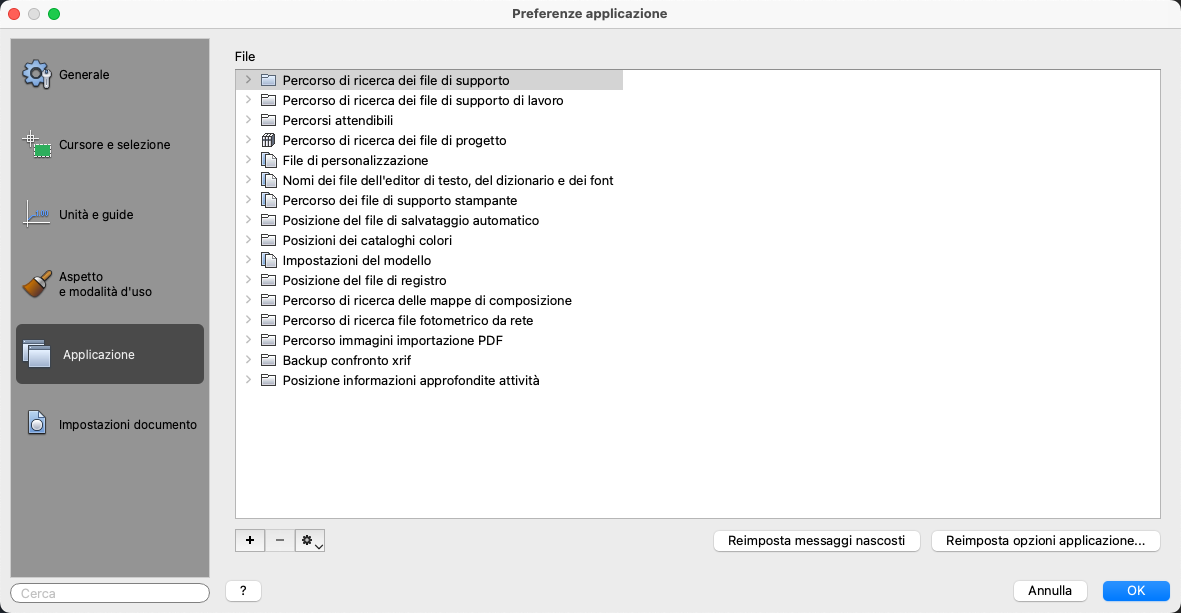 Elenca le cartelle in cui il programma cerca i diversi file, ad esempio quelli di supporto, dei driver, dei menu e così via. Elenca inoltre le impostazioni facoltative definite dall'utente, ad esempio quelle relative ai dizionari da utilizzare per il controllo ortografico.