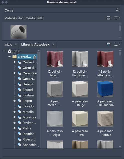 La libreria dei materiali standard di Autodesk è accessibile dal Browser dei materiali.