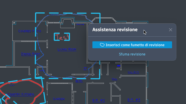 Le revisioni possono essere importate come file PDF, PNG o JPG e vengono sovrapposte al disegno nell'area di lavoro Traccia. Le revisioni nel file importato vengono automaticamente identificate come testom, multidirettrici e fumetti di revisione. Assistenza revisione consente di inserire le revisioni nel disegno come geometria.