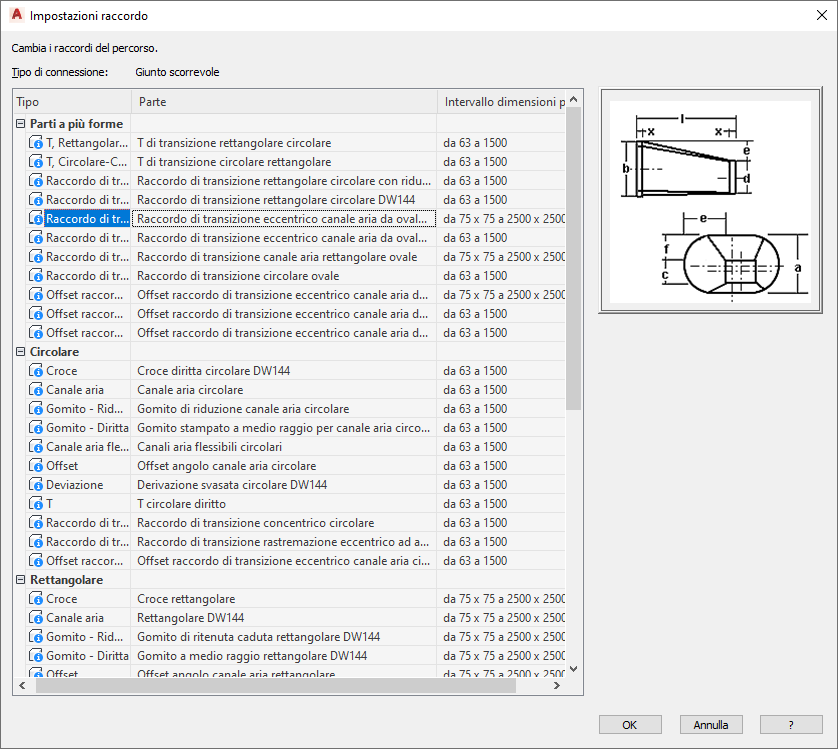 Nel foglio di lavoro Impostazioni raccordo viene mostrato il tipo di connessione e sono elencati i tipi e le parti disponibili.