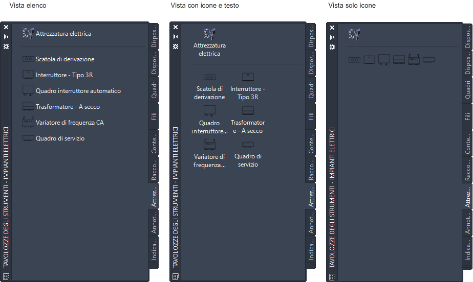La stessa tavolozza degli strumenti visualizzata in tre modi diversi