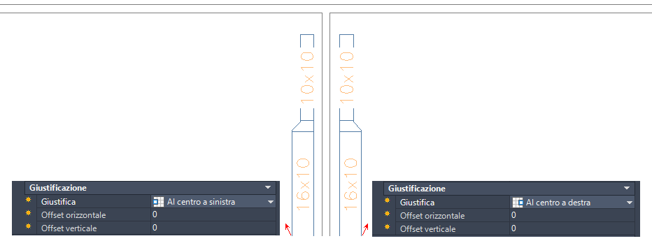 Nell'esempio seguente la giustificazione In alto a sinistra viene confrontata con la giustificazione In alto a destra di un oggetto canale aria. La direzione di disegno, indicata dalle frecce, determina la modalità di rappresentazione della giustificazione nel disegno.