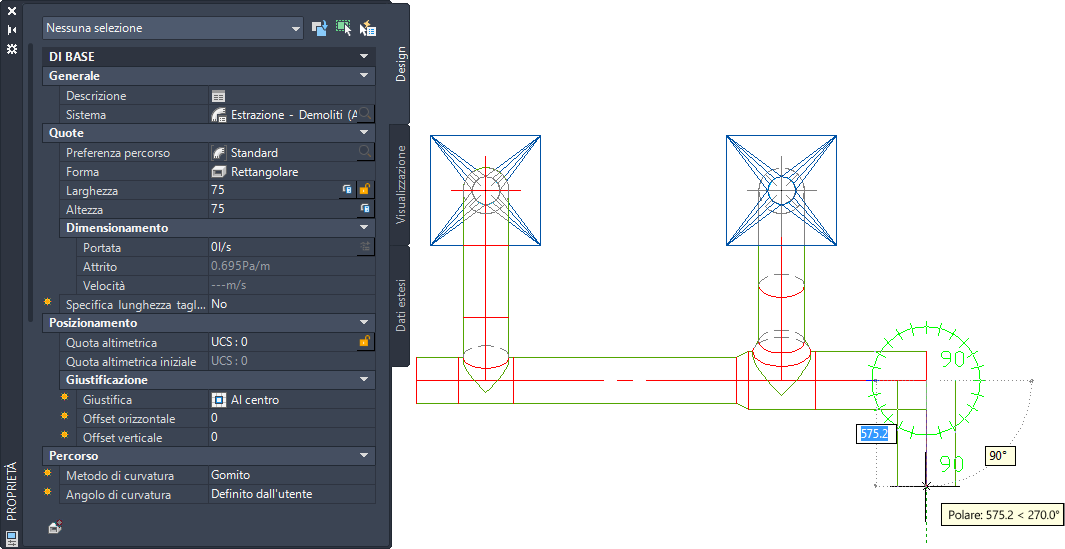 Se vengono assegnati valori di flusso all'attrezzatura di emissione, è possibile utilizzare lo strumento di dimensionamento dinamico per calcolare le dimensioni della rete di canali aria nella fase di disegno dei tratti di canale aria. È inoltre possibile utilizzare lo strumento di dimensionamento dinamico per la modifica di tratti di canale aria esistenti.