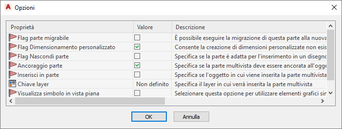Finestra di dialogo Opzioni per una parte multivista parametrica