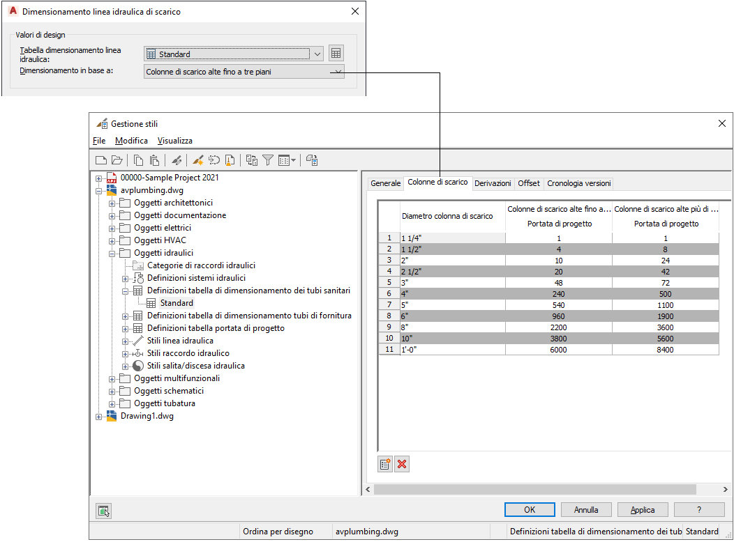 Quando si definisce il tratto di linea di scarico come colonna di scarico alta fino a tre piani o più di tre piani, i calcoli di dimensionamento vengono eseguiti in base ai dati della scheda Colonne di scarico della tabella di dimensionamento della linea idraulica di scarico (tabella di dimensionamento tubo), le cui definizioni si trovano in Gestione stili.