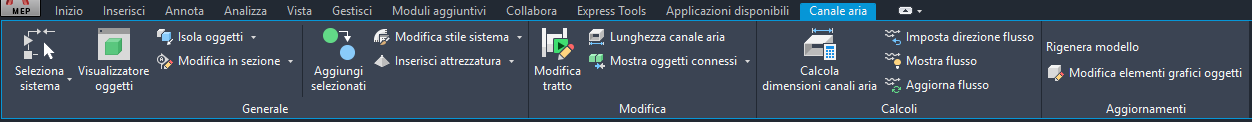 - Le schede contestuali visualizzate variano in base all'oggetto selezionato nell'area di disegno. Quando si seleziona un canale aria, nella barra multifunzione viene visualizzata la scheda contestuale Canale aria. I comandi disponibili nelle schede contestuali corrispondono a quelli dei menu di scelta rapida dei singoli oggetti (visualizzabili mediante clic con il pulsante destro del mouse).