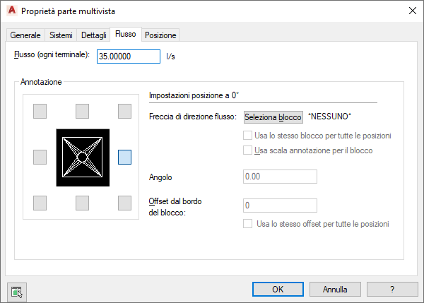 È possibile specificare fino a 8 posizioni per inserire le frecce di direzione del flusso intorno al terminale di aerazione, selezionare il blocco per la freccia di direzione del flusso e scegliere di utilizzare lo stesso blocco per tutte le frecce o selezionare blocchi diversi in base alla posizione. È inoltre possibile specificare l'angolo di rotazione e la distanza di offset dal terminale di aerazione per ogni freccia di direzione del flusso, nonché un valore di flusso.