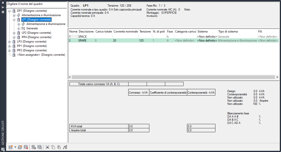 In Gestione circuiti vengono visualizzati i circuiti definiti nel disegno e nel database di progetto, suddivisi in base al tipo di quadro e sistema, come illustrato di seguito.