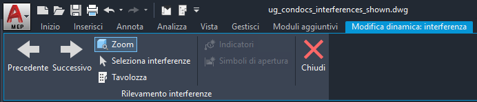 Con un disegno aperto, fare clic su scheda Analizza gruppo Interroga Rilevamento interferenze . Nella tavolozza Rilevamento interferenze, fare clic su per avviare l'analisi. Al termine dell'analisi, individuare nella barra multifunzione la scheda Modifica dinamica ed esaminare il gruppo Rilevamento interferenze.