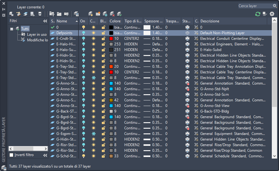 Gestore proprietà layer consente di visualizzare e gestire i layer nel disegno corrente.