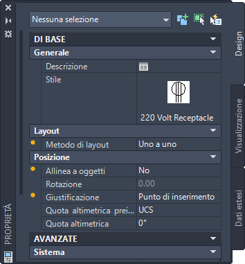 Sebbene sia possibile creare e configurare strumenti oggetto per altri sistemi dell'edificio tramite la programmazione AutoLISP, le proprietà oggetto possono essere impostate direttamente nel riquadro proprietà dello strumento come illustrato di seguito solo tramite gli strumenti per gli oggetti menzionati in precedenza.