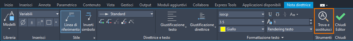 Il comando TROVA ora è in grado di cercare e sostituire il testo in AMNOTE e l'opzione Trova e sostituisci è stata aggiunta alla scheda contestuale della barra multifunzione Nota direttrice.
