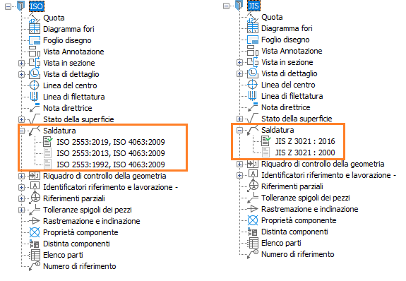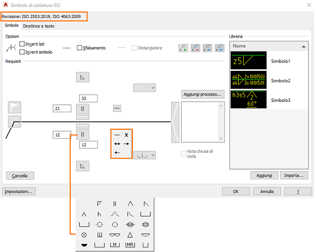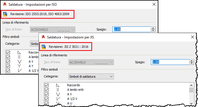 Nella finestra di dialogo Impostazioni di saldatura vengono visualizzate le ultime revisioni ISO e JIS. I simboli di saldatura e nastro ausiliario corrispondenti vengono inoltre elencati nel Filtro simboli.