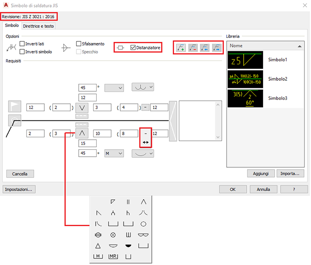 Inoltre, la finestra di dialogo Simbolo di saldatura JIS include un nuovo distanziatore e controlli per il supporto di linee di riferimento multiplo.