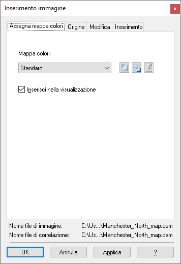 È possibile utilizzare la finestra di dialogo Inserimento immagine per assegnare una banda di dati a ciascun canale di colore e stabilire quali canali includere nella visualizzazione. In qualunque momento è possibile modificare l'assegnazione di banda e visualizzare i risultati sullo schermo.