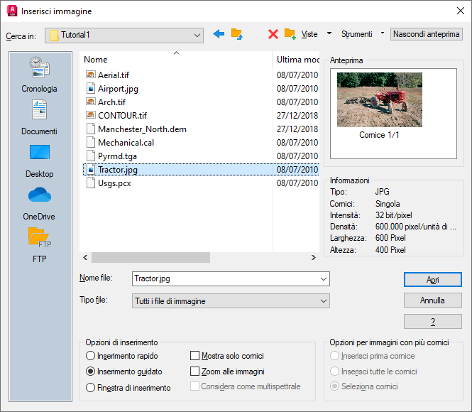 Quando si inserisce un'immagine con il comando Inserisci del Set di strumenti AutoCAD Raster Design, è possibile visualizzare in anteprima l'immagine e le informazioni quali il tipo di file, l'intensità del colore e la densità. La colonna di cartelle sul lato sinistro della finestra di dialogo Inserisci immagine viene definita elenco delle risorse. Contiene i collegamenti alle cartelle locali, ad esempio la cartella Desktop o Documenti.