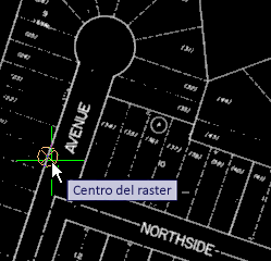 - Spostare il cursore sul bordo ovest di Elmhurst Avenue ed eseguire lo snap al centro della linea raster. Vengono visualizzati il simbolo di snap raster e una descrizione comando Centro del raster per confermare l'operazione.