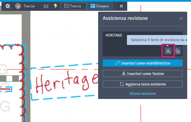 - È ora possibile aggiungere più revisioni di testo ad un unico inserimento di Assistenza revisione. Ciò significa che se si dispone di più stringhe di testo all'interno di più revisioni, è possibile risparmiare tempo aggiungendo tutte le stringhe allo stesso oggetto testom o multidirettrice. Quando la finestra di testo di Assistenza revisione è aperta, fare clic su Seleziona testo di revisione da aggiungere, quindi selezionare gli oggetti di revisione testo da aggiungere.