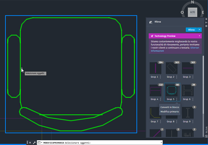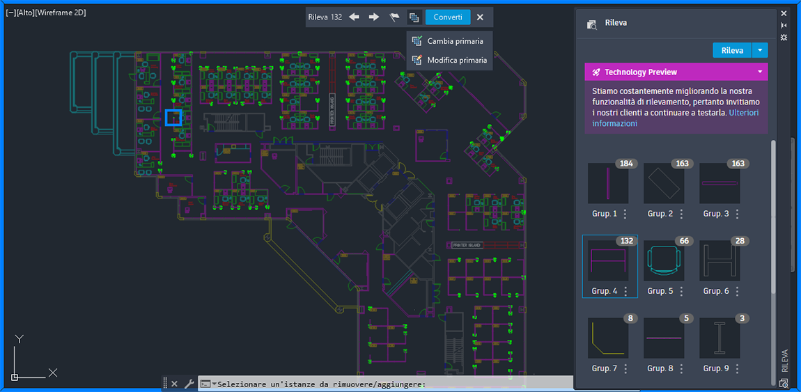Il comando RILEVAB, precedentemente noto come RILEVA, utilizza Autodesk AI per identificare e raggruppare oggetti simili in un disegno per una facile conversione in blocchi.