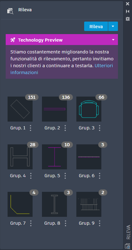 Una volta eseguito il comando RILEVAB, la tavolozza Rileva mostrerà tutti i gruppi rilevati in una nuova vista miniature.