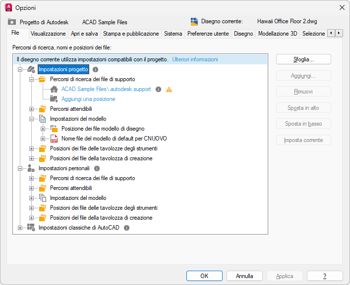 Durante l'impostazione dei file di supporto per un progetto di Autodesk Docs, AutoCAD crea una cartella denominata .autodesk.support. AutoCAD esegue le ricerche in .autodesk.support (e nelle relative sottocartelle) come punto di partenza all'interno del progetto di Autodesk Docs per trovare i file di supporto necessari. Questo valore può essere ulteriormente esteso aggiungendo altre posizioni dei file di supporto in più progetti. È inoltre possibile aggiungere posizioni e impostazioni personalizzate in base alle esigenze.