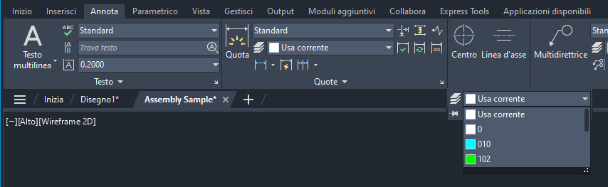 - Sulla barra multifunzione, scheda Annota > gruppo Linee d'asse, utilizzando il controllo Layer.