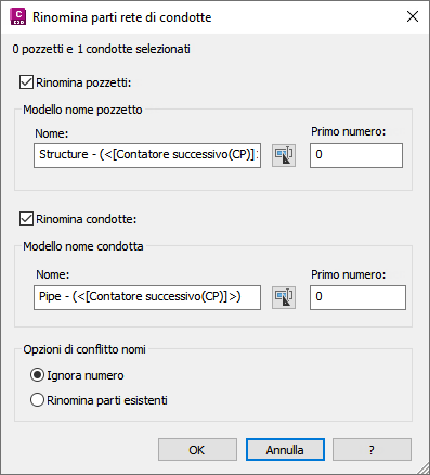 Rinomina parti È possibile scegliere di rinominare/rinumerare solo condotte, solo pozzetti o entrambi.
