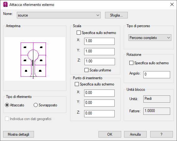 - Nella finestra di dialogo Riferimenti esterni, impostare Punto di inserimento su 0,0,0, Scala su 1,1,1, e Angolo di rotazione su 0.