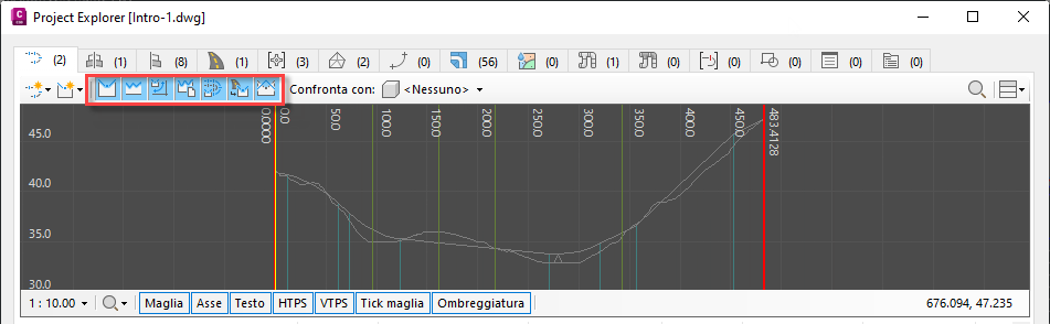 Il valore di amplificazione della scala altimetrica e le impostazioni mostra/nascondi per ciascun componente visivo di una vista profilo o sezione specifica possono essere controllate anche dai controlli vista associati nella finestra Project Explorer principale, come indicato di seguito.