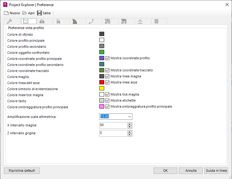 Le restanti cinque schede nella finestra Preferenze di Project Explorer controllano le impostazioni di colore, stile, griglia e scala delle varie viste profilo e sezione nella finestra Project Explorer principale.