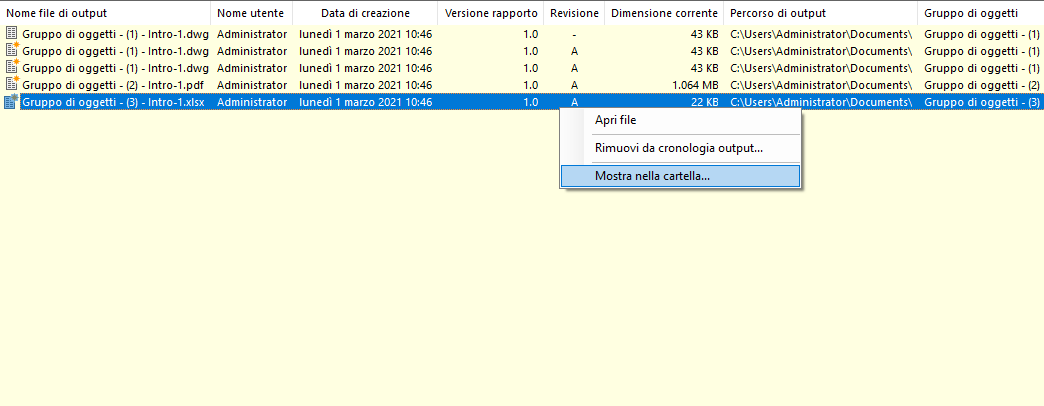 Fare clic con il pulsante destro del mouse su un elemento qualsiasi nell'elenco per accedere alle opzioni per aprire il file generato, aprire la cartella in Esplora risorse in cui il file generato è stato creato o rimuovere singole voci dall'elenco della cronologia di output.