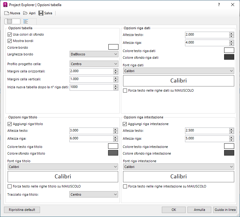 Le Opzioni tabella determinano il colore bordo, le dimensioni e il tipo di font, i margini delle celle e lo stile di visualizzazione generale di tutte le tabelle AutoCAD generate da Project Explorer.