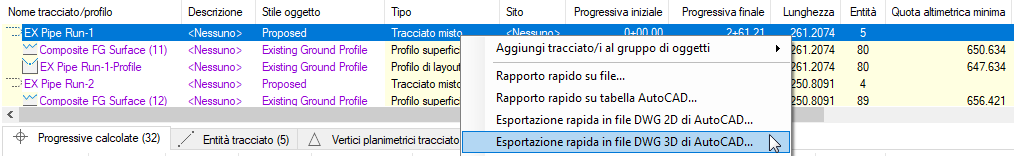 Analogamente, è possibile esportare un file DWG 3D di AutoCAD. Selezionare uno o più oggetti in un riquadro elenco oggetto nella finestra Project Explorer e selezionare l'opzione "Esportazione rapida in file DWG 3D di AutoCAD" dal menu di scelta rapida.