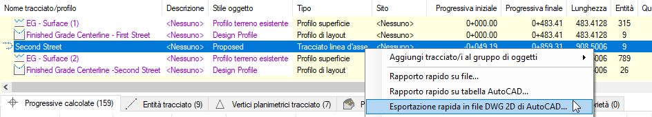 Per utilizzare l'opzione Esportazione rapida in file DWG 2D di AutoCAD, selezionare uno o più oggetti da un riquadro elenco oggetti qualsiasi nella finestra Project Explorer e selezionare l'opzione "Esportazione rapida in file DWG 2D di AutoCAD" dal menu di scelta rapida.