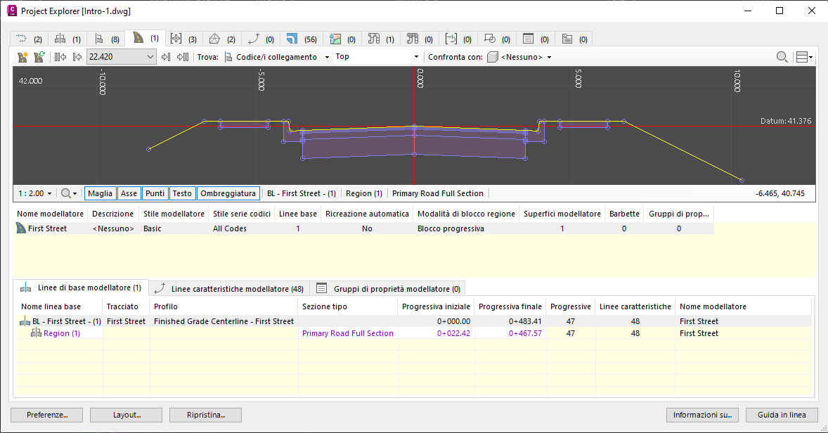 Modificare l'intervallo progressive tracciato/profilo per le entità linea, entità curva ed entità transizione.