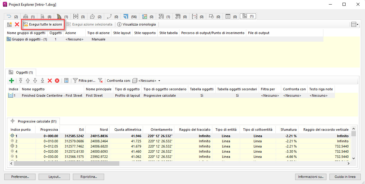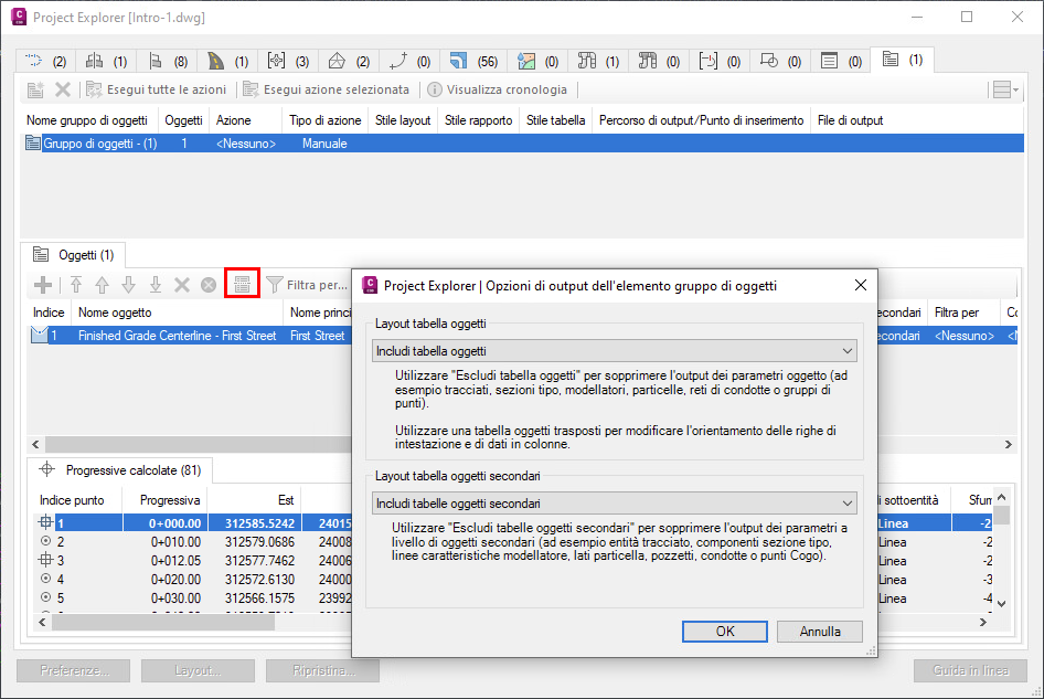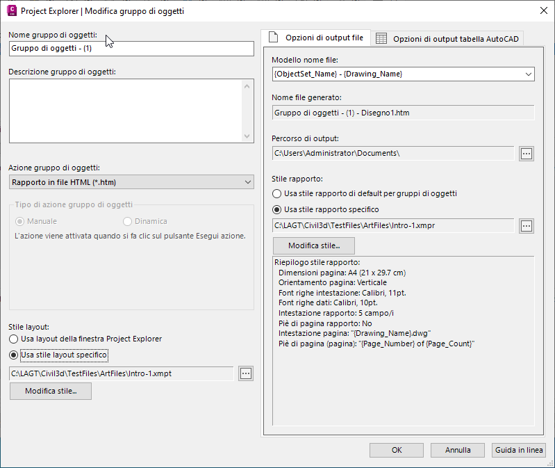 Un gruppo di oggetti è un elenco definibile dall'utente di oggetti Civil 3D a cui è possibile assegnare un'azione e altri dettagli correlati. Le azioni possono essere attivate manualmente o, in alcuni casi, dinamicamente quando Project Explorer rileva che una parte dipendente del progetto è stata modificata. I gruppi di oggetti vengono in genere utilizzati per automatizzare la produzione di rapporti, fogli di calcolo, Carte di AutoCAD o tabelle di AutoCAD preconfigurati e la combinazione esatta di stili, filtri e istruzioni di output richiesti dipende dal tipo di azione e oggetto assegnato.