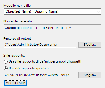 | Rapporto in file CSV | Utilizzare l'opzione Rapporto in file CSV per generare un file di rapporto in uscita in formato CSV quando si fa clic sul pulsante Esegui azione. Per utilizzare questa opzione è necessario selezionare uno Stile layout che determini il tipo di layout e di file del rapporto e un percorso di output. |