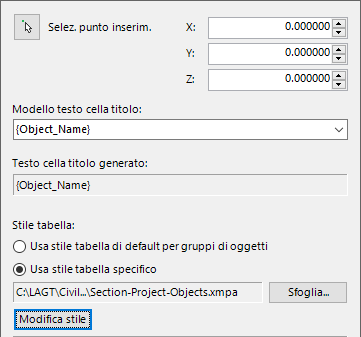Utilizzare questa opzione per determinare la posizione dell'angolo superiore sinistro della tabella o delle tabelle AutoCAD create da ogni gruppo di oggetti. La posizione può essere specificata digitando una coordinata XY nella finestra o selezionando un punto nella finestra di AutoCAD.