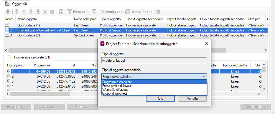 Per alcuni tipi di oggetti di Civil 3D, è disponibile una serie di tipi di oggetto secondario per un elemento gruppo di oggetti elencato. Ad esempio, per i tracciati è possibile generare un rapporto che includa progressive calcolate, entità tracciato, vertici planimetrici tracciato o progressive fondamentali per sopraelevazione.
