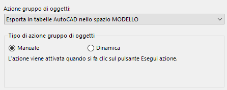 A ciascun gruppo di oggetti è possibile assegnare un'azione gruppo di oggetti facoltativa. Le azioni vengono in genere utilizzate per automatizzare il processo di generazione di rapporti, fogli di calcolo o tabelle AutoCAD. Il parametro Tipo di azione gruppo di oggetti determina se l'azione assegnata deve essere attivata, manualmente o dinamicamente.