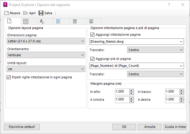 Le opzioni del rapporto determinano le dimensioni della pagina, l'orientamento della pagina, i margini della pagina, l'intestazione del rapporto, l'intestazione della pagina e il piè di pagina per tutti i rapporti e i fogli di calcolo generati da Project Explorer.
