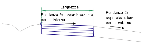 Può essere utilizzato per sostituire la pendenza della corsia in rettifilo e collegare il bordo esterno della corsia di percorrenza alla quota altimetrica di un profilo. Come obiettivi per la specifica della quota altimetrica è possibile utilizzare i seguenti tipi di oggetti: profili, polilinee 3D, linee caratteristiche o figure di rilievo. |