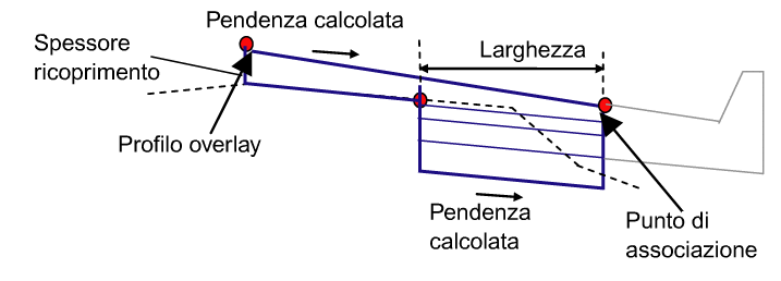Nella figura che segue viene mostrata una situazione con un profilo di scostamento del ricoprimento. Se si specifica il profilo di ricoprimento, la pendenza viene calcolata tra la quota altimetrica del profilo in prossimità del bordo interno del ricoprimento e il punto di associazione.