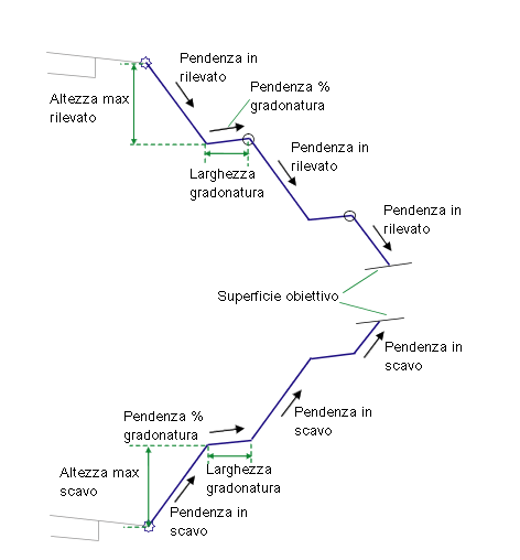 Questo componente sezione tipo inserisce collegamenti per la creazione di pendenze in scavo o in rilevato con gradonatura ripetuta.
