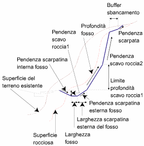 Se la scarpata non è al di sotto della superficie rocciosa, vengono aggiunti la scarpatina interna, il fondo del fosso e la scarpatina esterna, e il collegamento in scavo della scarpata viene esteso dalla fine della scarpatina esterna alla Superficie scarpata, secondo la Pendenza in scavo specificata.