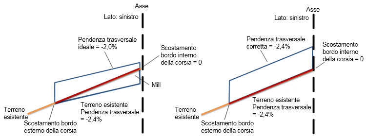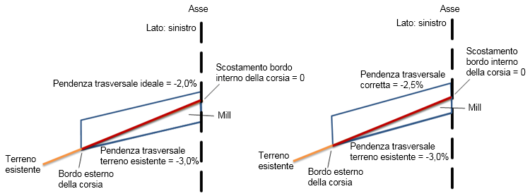 La pendenza trasversale corretta è sempre impostata sullo stesso valore della pendenza del terreno esistente.