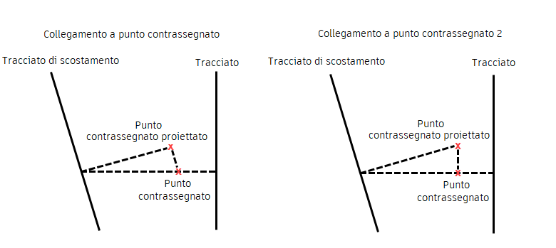La differenza principale tra i componenti sezione tipo Collegamento a punto contrassegnato 2 e Collegamento a punto contrassegnato è nella loro applicazione, quando il punto contrassegnato si trova su una linea base della sezione tipo con scostamento diversa rispetto al collegamento. Nella figura seguente viene mostrata la differenza tra i due componenti sezione tipo.