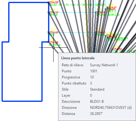 Survey Network 1 per visualizzare le raccolte dei dati di rilievo, inclusi punti di controllo, direzioni e impostazioni.